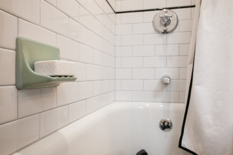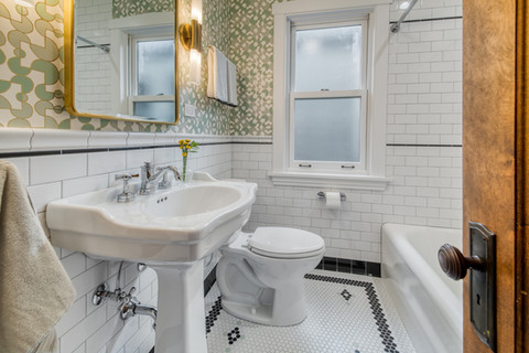 Plumbing: Plumbing 1-2-3; Tub Refinishing: A Touch Glazing; Wallpaper: Hygge & West; Wallpaper installation: Rich at Wallpaper Pros; Wall Tile: Edgebrook Tile; Floor tile: Mosaic Tile Supply; Shower fixtures: Build.com; Floor Heating: Warmyourfloor.com; Sink, fixtures, vent cover: Signature Hardware; Ceiling Light: OldeBrickLighting on Etsy; Sconces: CB2; Medicine Cabinet: Pottery Barn; Toilet: American Standard; Walnut Cabinet Door: The Cabinet Door Store; Wood Trim: Owl Hardware Lumber; Cabinet Latch: Rejuvenation; Cabinet Hinges: House of Antique Hardware; Cabinet Shelving Brackets: ROCKLER; Door Stop Hook: Fry Specialty; Towel Bar & Hook: West Elm; Toilet Paper Holder: Delta on Amazon; Tools: Harbor Freight Tools 400; Various Supplies: Home Depot, Menards, Ace Hardware in Norwood Park and Bridgeport